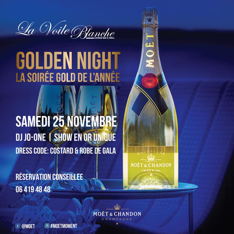 Evénements > Golden Night Retour à la liste Golden Night Cet événement est terminé 25 novembre 2017 à 20 h 00 Détails Date : 25 novembre 2017 Heure: 20 h 00 Catégorie de l'événement: Soirées Site Web : Voir le site Voir la page Infos Be ready ! La Voile Blanche vous propose LA soirée gold de l’année avec Moët & Chandon ! DJ Jo-One assurera l’ambiance, un show sera également prévu. Dress code : Costard et robe de gala Réservation conseillée : 06 419 48 48 + Google Agenda+ Exportation iCal Lieu La Voile Blanche Côte Sauvage, Pointe-Noire, Congo + Google Map