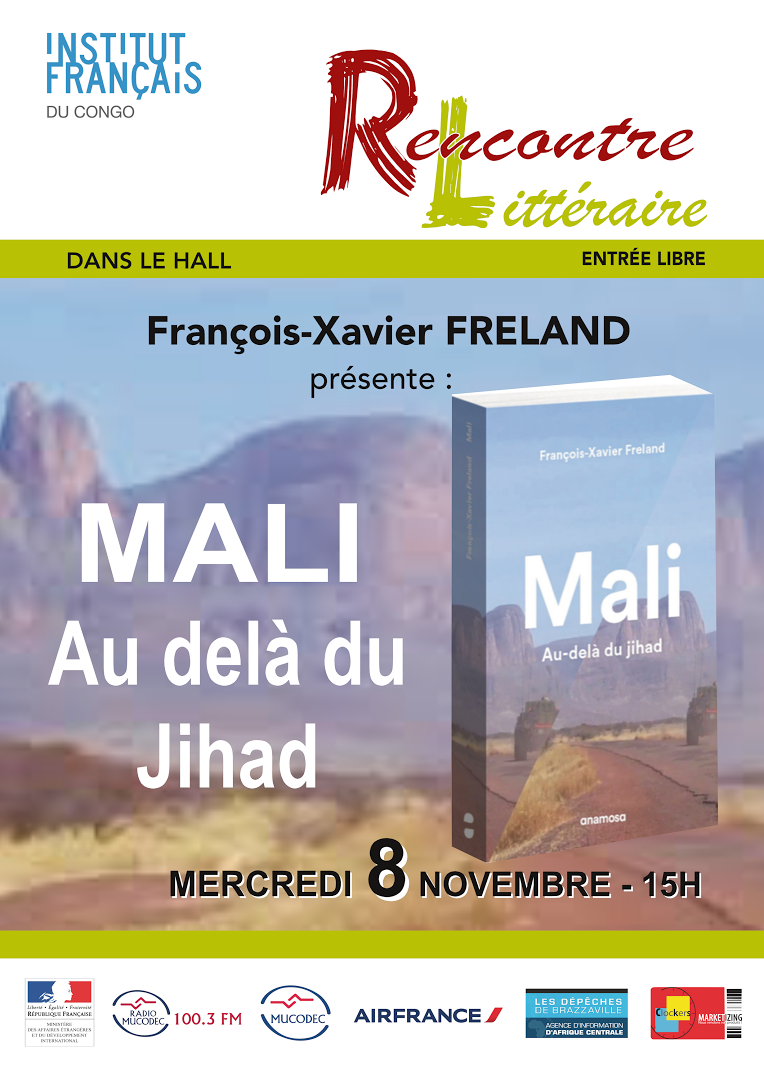 Evénements > Rencontre littéraire – François Xavier FRELAND Retour à la liste Rencontre littéraire – François Xavier FRELAND Cet événement est terminé 8 novembre 2017 à 15 h 00 Détails Date : 8 novembre 2017 Heure: 15 h 00 Catégorie de l'événement: Rencontre Site Web : Voir le site Infos Venez rencontrer et échanger avec François-Xavier Freland, auteur du livre « Mali, au delà du Jihad » Entrée libre Dans le hall de l’IFG + Google Agenda+ Exportation iCal Lieu Institut Français du Congo Rond point CCF, Place de la République, Brazzaville, Congo + Google Map Téléphone : 22.281.19.00